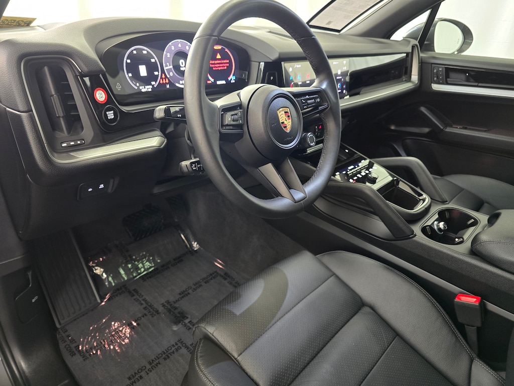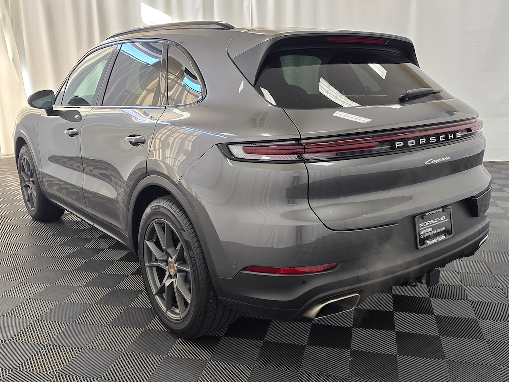 Certified. Black w/Leather Seat Trim w/Leather Interior, 14-Way Power Seats w/Comfort Memory, Adaptive Cruise Control w/Lane Keep Assist (LKA), BOSE Surround Sound System, Panoramic Roof System, Premium Package, Rear Heated Seats, Roof Rails in Aluminum Finish, Trailer Hitch w/o Tow Ball, Wheel Center Caps w/Colored Porsche Crest, Wheels: 20 Cayenne S in Vesuvius Grey, Window Trim in High Gloss Black. Quartzite Grey Metallic 2025 Porsche Cayenne AWD 8-Speed Automatic with Tiptronic 3.0L V6 Porsche Approved Certified Pre-Owned Details: * Transferable Warranty * Multipoint Point Inspection * Includes Trip Interruption reimbursement * Roadside Assistance * Vehicle History * Limited Warranty: 24 Month/Unlimited Mile beginning after new car warranty expires or from certified purchase date * Warranty Deductible: $0 Odometer is 1721 miles below market average!